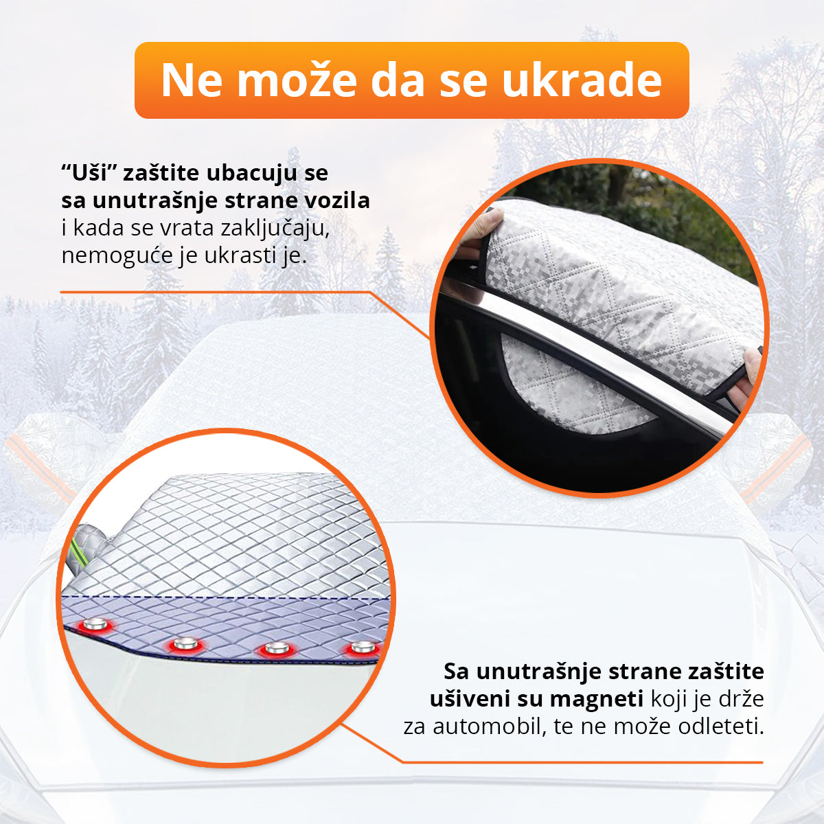 Zaštita na jednom kraju ima ušivene magnete koji se čvrsto uhvate za haubu, a na drugom kraju dodatke koji se ubace u auto i zatvore vratima tako da ne može odleteti sa auta ni tokom najvećih zimskih oluja.